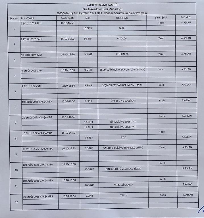 Eylül Ayı Sorumluluk Sınav Programımız Yayınlanmıştır